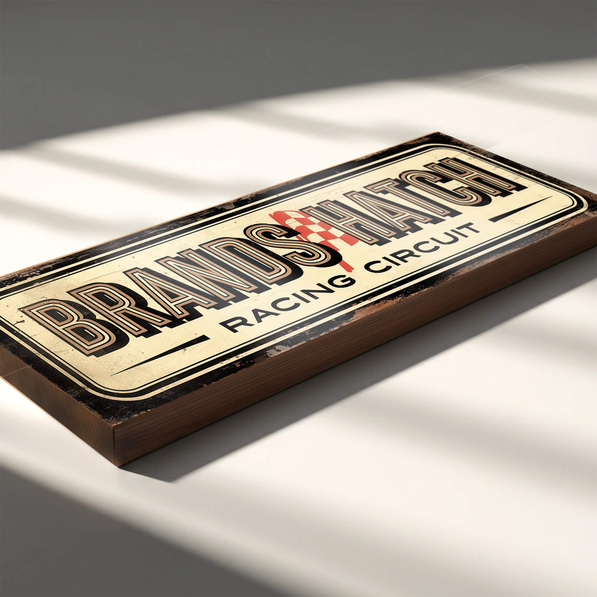 Brands Hatch Racing Circuit sign. Featuring a cream base, bold lettering and a classic chequered-flag detail, it brings the look and energy of race day straight into your home, garage, office or workshop.