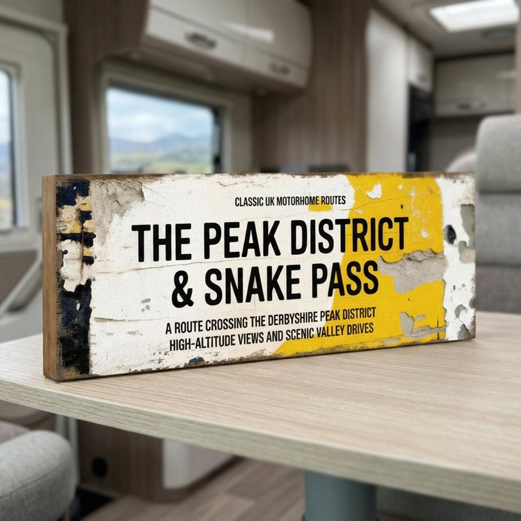 Conquer one of England’s most legendary drives with this "The Peak District & Snake Pass" vintage-style travel sign. Part of the "Classic UK Motorhome Routes" series, this design celebrates the exhilarating journey across the Derbyshire Peak District, famous for its high-altitude views and scenic valley drives.